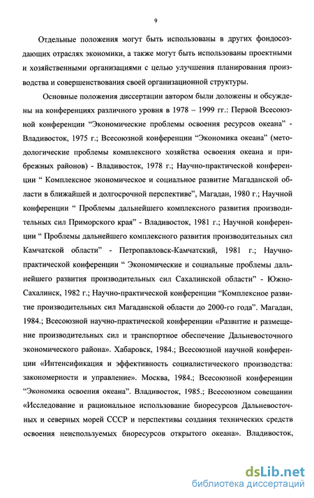 Основные положения диссертации автором были доложены и обсуждены на конференциях различного уровня в 1978 - 1999 гг.: Первой Всесоюзной конференции "Экономические проблемы освоения ресурсов океана" -Владивосток, 1975 г.; Всесоюзной конференции "Экономика океана" (методологические проблемы комплексного хозяйства освоения океана и прибрежных районов) - Владивосток, 1978 г.; Научно-практической конференции " Комплексное экономическое и социальное развитие Магаданской области в ближайшей и долгосрочной перспективе", Магадан, 1980 г.; Научной конференции " Проблемы дальнейшего комплексного развития производительных сил Приморского края" - Владивосток, 1981 г.; Научной конференции " Проблемы дальнейшего комплексного развития производительных сил Камчатской области" - Петропавловск-Камчатский, 1981 г.; Научно-практической конференции " Экономические и социальные проблемы дальнейшего развития производительных сил Сахалинской области" - Южно-Сахалинск, 1982 г.; Научно-практической конференции "Комплексное развитие производительных сил Магаданской области до 2000-го года". Магадан, 1984.; Всесоюзной научно-практической конференции «Развитие и размещение производительных сил и транспортное обеспечение Дальневосточного экономического района». Хабаровск, 1984.; Всесоюзной научной конференции «Интенсификация и эффективность социалистического производства: закономерности и управление». Москва, 1984.; Всесоюзной конференции "Экономика освоения океана". Владивосток, 1985.; Всесоюзном совещании «Исследование и рациональное использование биоресурсов Дальневосточных и северных морей СССР и перспективы создания технических средств освоения неиспользуемых биоресурсов открытого океана». Владивосток,