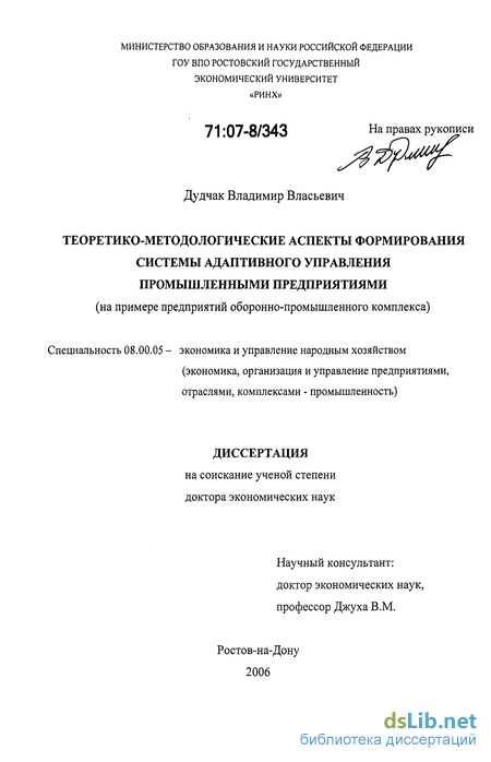 Предметом диссертационного исследования является совокупность организационно-экономических условий, моделей и алгоритмов адаптивного управления промышленными предприятиями, позволяющих адекватно описывать, измерять состояние предприятий, формировать адаптивные системы их управления и совершенствования.