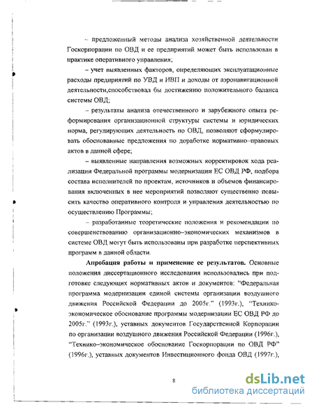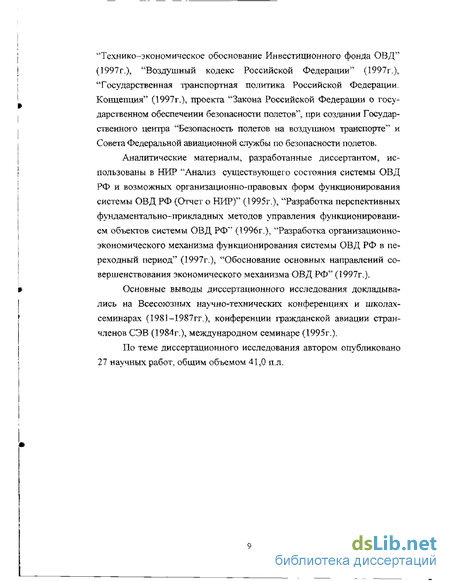 Апробация работы и применение ее результатов. Основные положения диссертационного исследования использовались при подготовке следующих нормативных актов и документов: "Федеральная программа модернизации единой системы организации воздушного движения Российской Федерации до 2005г." (1993г.), "Технико-экономическое обоснование программы модернизации ЕС ОВД РФ до 2005г." (1993г.), уставных документов Государственной Корпорации по организации воздушного движения Российской Федерации (1996г.), "Технико-экономическое обоснование Госкорпорации по ОВД РФ" (1996г.), уставных документов Инвестиционного фонда ОВД (1997г.),