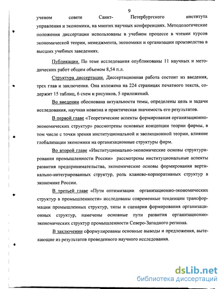 Анализ организационно-экономических структур не только по формам построения, но и по содержанию, позволяет вычленить один из важных факторов экономического роста рыночной экономики. Это обуславливает актуальность и значимость проведенного диссертационного исследования.
