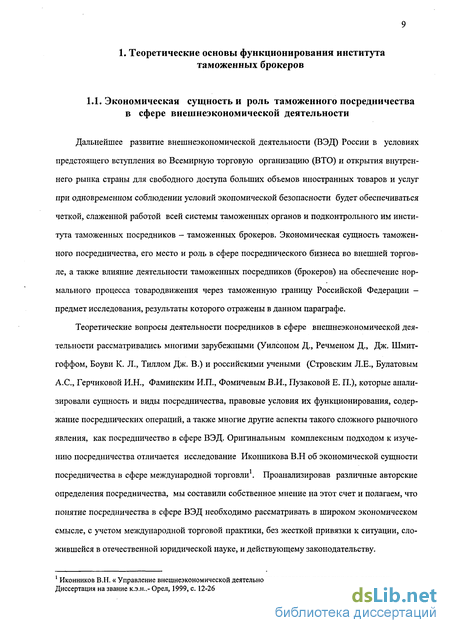 Дальнейшее развитие внешнеэкономической деятельности (ВЭД) России в условиях предстоящего вступления во Всемирную торговую организацию (ВТО) и открытия внутреннего рынка страны для свободного доступа больших объемов иностранных товаров и услуг при одновременном соблюдении условий экономической безопасности будет обеспечиваться четкой, слаженной работой всей системы таможенных органов и подконтрольного им института таможенных посредников - таможенных брокеров. Экономическая сущность таможенного посредничества, его место и роль в сфере посреднического бизнеса во внешней торговле, а также влияние деятельности таможенных посредников (брокеров) на обеспечение нормального процесса товародвижения через таможенную границу Российской Федерации -предмет исследования, результаты которого отражены в данном параграфе.