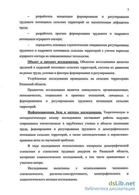 Объект и предмет исследования. Объектом исследования является трудовой и кадровый потенциал сельских территорий, система их движения на рынке труда, условия и факторы формирования и регулирования. Углубленные исследования проводились на сельских территориях Рязанской области.