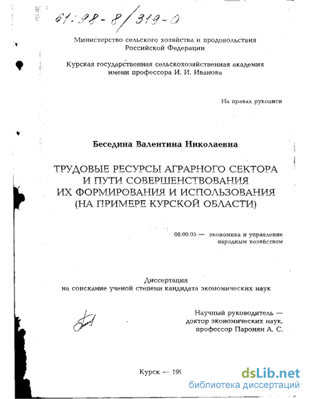 рыночной экономикой и определены меры совершенствования системы подготовки кадров в сельском хозяйстве Курской области;