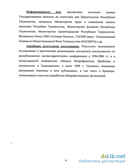 Информационную базу диссертации составили данные Государственного комитета по статистике при Правительстве Республики Таджикистан, материалы Министерства труда и социальной защиты населения Республик Таджикистан, Министерства финансов Республики Таджикистан, Министерства здравоохранения Республики Таджикистан, Всемирного Банка, НПО «Ситораи Наджот», ТАСИФ (ныне - Национальный Социально-Инвестиционный Фонд Таджикистана (НАСИФТ)) и др.