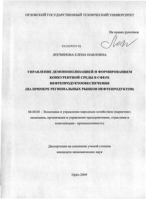 Научная новизна диссертационного исследования состоит в разработке теоретико-методических положений и практических рекомендаций по демонополизации и формированию конкурентной среды в сфере нефтепродуктообеспечения, включающих в себя комплекс методов мониторинга, прямого и косвенного регулирования конкуренции на региональных товарных рынках топлива, что позволяет, в отличие от разработок, выполненных иными авторами, своевременно выявлять негативные тенденции монополизма на рынках и формировать превентивные программы демонополизации.