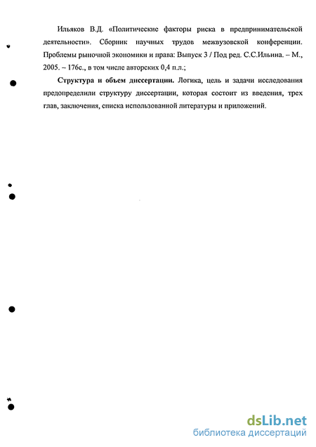 Ильяков В.Д. «Политические факторы риска в предпринимательской деятельности». Сборник научных трудов межвузовской конференции. Проблемы рыночной экономики и права: Выпуск 3 / Под ред. С.С.Ильина. - М., 2005. - 176с, в том числе авторских 0,4 п.л.;