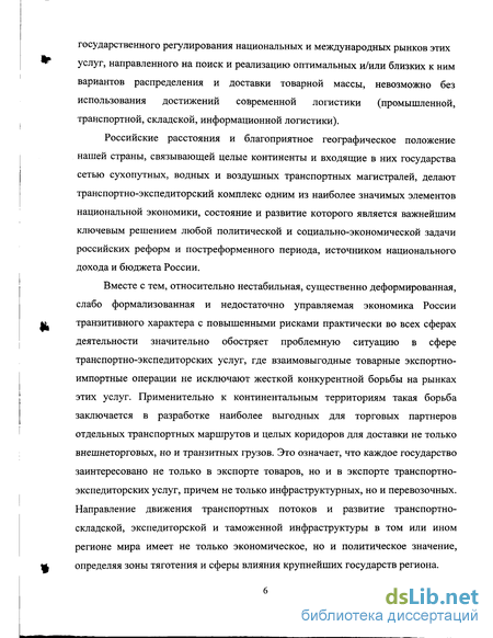 Российские расстояния и благоприятное географическое положение нашей страны, связывающей целые континенты и входящие в них государства сетью сухопутных, водных и воздушных транспортных магистралей, делают транспортно-экспедиторский комплекс одним из наиболее значимых элементов национальной экономики, состояние и развитие которого является важнейшим ключевым решением любой политической и социально-экономической задачи российских реформ и постреформенного периода, источником национального дохода и бюджета России.