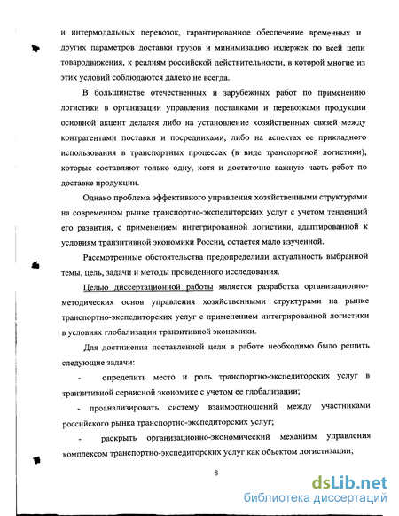 Целью диссертационной работы является разработка организационно-методических основ управления хозяйственными структурами на рынке транспортно-экспедиторских услуг с применением интегрированной логистики в условиях глобализации транзитивной экономики.