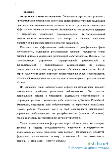 Актуальность темы исследования. Состояние и перспективы рыночных преобразований в российской экономике определяются степенью реализации программ институционального развития в целях реального становления эффективных рыночных институтов. Важнейшие из них разработка системы и механизмов управления территориальными (субфедеральными) имущественными комплексами, роль которых в решении социально-экономических проблем регионов является решающей.