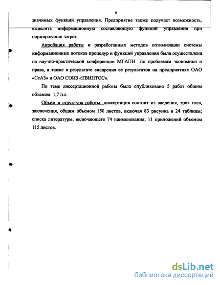 Апробация работы и разработанных методов оптимизации системы информационных потоков процедур и функций управления была осуществлена на научно-практической конференции МГАПИ по проблемам экономики и права, а также в результате внедрения ее результатов на предприятиях ОАО «СеАЗ» и ОАО СОИЗ «ТВИНТОС».