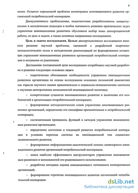Цель и задачи исследования. Целью диссертационного исследования является решение научной проблемы, связанной с разработкой теоретико-методологических основ и методических рекомендаций по формированию концепции управления инновационным развитием организаций потребительской кооперации и механизма ее реализации.