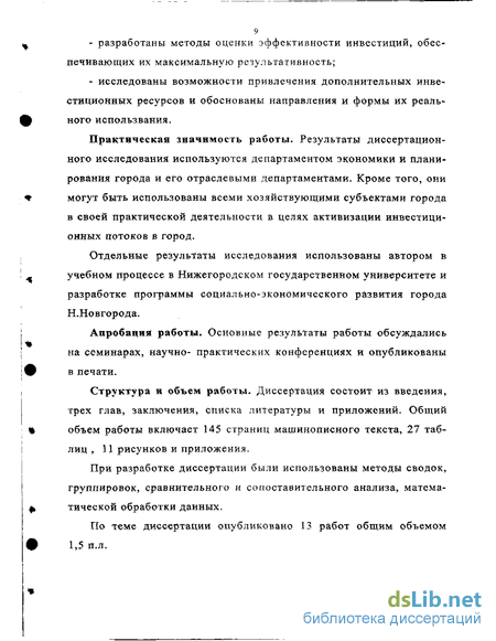 При этом в диссертации предполагается решить следующие задачи: обосновать необходимость формирования благоприятного инвестиционного климата области, основанного на минимизации инвестиционных рисков и выявлении наиболее привлекательных объектов инвестирования; дать анализ структуры и динамики инвестиций в социально-экономический комплекс крупных городов, используя в качестве примера один из крупнейших городов России, каковым является Нижний Новгород; -дать анализ возможностей города по поиску дополнительных источников инвестирования; -определить пути повышения эффективности управления инвестиционным процессом в городе.