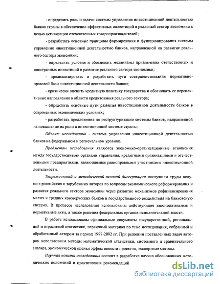 Цель и задачи исследования. Основная цель исследования состоит в анализе современной теории и практики управления инвестиционной деятельностью коммерческих банков для определения и обоснования основных принципов и практических возможностей эффективного участия банков Российской Федерации в инвестировании реального сектора экономики, направленного на поддержку и улучшение финансового положения отечественных производителей.