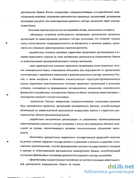 деятельности банков России посредством совершенствования государственной инвестиционной политики, управления деятельностью кредитных организаций, расширения источников ресурсов для инвестирования реального сектора экономики через коммерческие банки.