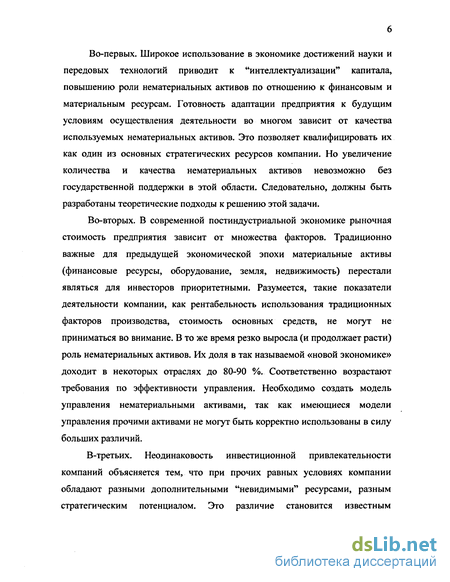 Во-первых. Широкое использование в экономике достижений науки и передовых технологий приводит к "интеллектуализации" капитала, повышению роли нематериальных активов по отношению к финансовым и материальным ресурсам. Готовность адаптации предприятия к будущим условиям осуществления деятельности во многом зависит от качества используемых нематериальных активов. Это позволяет квалифицировать их как один из основных стратегических ресурсов компании. Но увеличение количества и качества нематериальных активов невозможно без государственной поддержки в этой области. Следовательно, должны быть разработаны теоретические подходы к решению этой задачи.