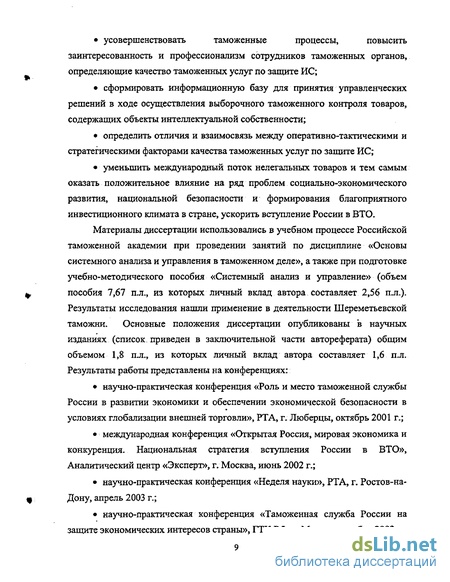 Материалы диссертации использовались в учебном процессе Российской таможенной академии при проведении занятий по дисциплине «Основы системного анализа и управления в таможенном деле», а также при подготовке учебно-методического пособия «Системный анализ и управление» (объем пособия 7,67 п.л., из которых личный вклад автора составляет 2,56 п.л.). Результаты исследования нашли применение в деятельности Шереметьевской таможни. Основные положения диссертации опубликованы в научных изданиях (список приведен в заключительной части автореферата) общим объемом 1,8 пл., из которых личный вклад автора составляет 1,6 п.л. Результаты работы представлены на конференциях: научно-практическая конференция «Роль и место таможенной службы России в развитии экономики и обеспечении экономической безопасности в условиях глобализации внешней торговли», РТА, г. Люберцы, октябрь 2001 г.; международная конференция «Открытая Россия, мировая экономика и конкуренция. Национальная стратегия вступления России в ВТО», Аналитический центр «Эксперт», г. Москва, июнь 2002 г.; научно-практическая конференция «Неделя науки», РТА, г. Ростов-на-Дону, апрель 2003 г.; научно-практическая конференция «Таможенная служба России на защите экономических интересов страны», ГТК РФ, г. Москва, октябрь 2003 г.; научно-практическая конференция «Основные аспекты таможенного дела на современном этапе», РТА, г. Люберцы, октябрь 2003 г. научно-практическая конференция «Таможня сквозь призму экономики и права», РТА, г. Люберцы, апрель 2004 г.