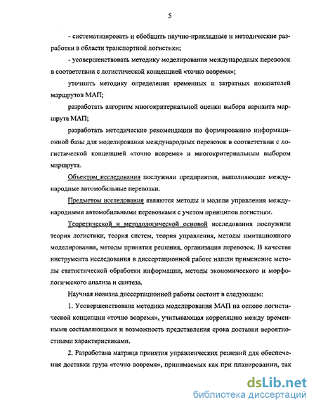 Целью диссертационного исследования является развитие существующих и разработка новых, основанных на логистической концепции «точно вовремя», методов управления, повышающих эффективность международных автомобильных перевозок.