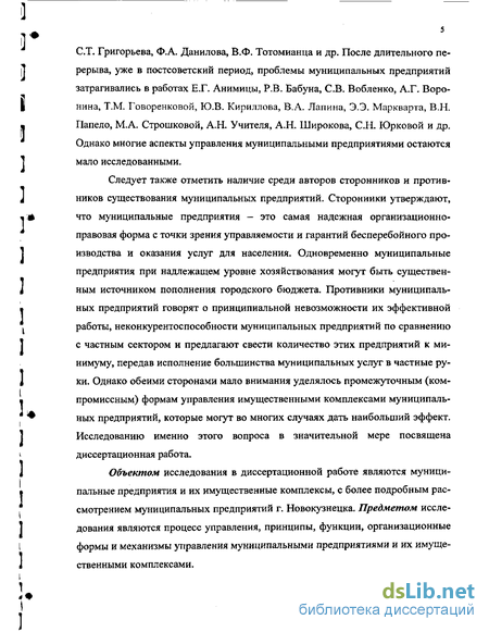 Объектом исследования в диссертационной работе являются муниципальные предприятия и их имущественные комплексы, с более подробным рассмотрением муниципальных предприятий г. Новокузнецка. Предметом исследования являются процесс управления, принципы, функции, организационные формы и механизмы управления муниципальными предприятиями и их имущественными комплексами.