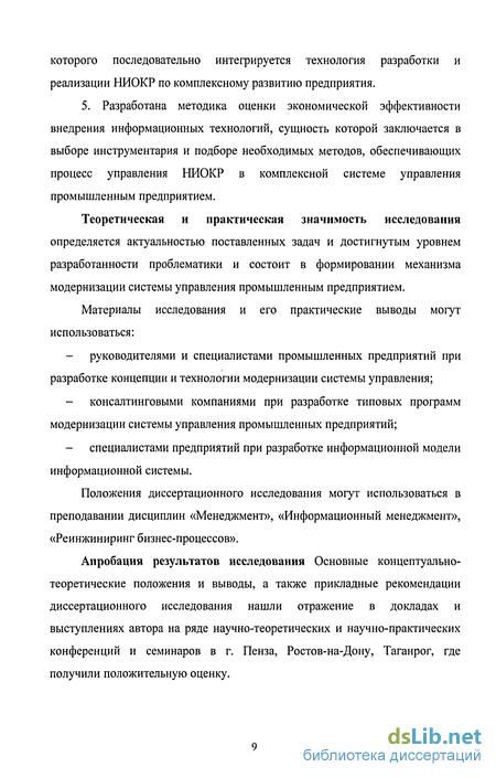 Степень разработанности проблемы. Теоретические и практические аспекты реструктуризации и модернизации системы управления предприятий на современном этапе развития отражены в работах Г. Клейнера, И. Мазура, Е.Румянцевой, Р. Фатхутдинова, Р. Фостера, Д. Хлебникова, В. Шапиро, в том числе, адаптация механизмов модернизации системы управления к специфике промышленных предприятий представлены в трудах Т. Долгопятовой, А. Кисилевой, Л. Михайлова, А. Нещадина, О. Перервы.