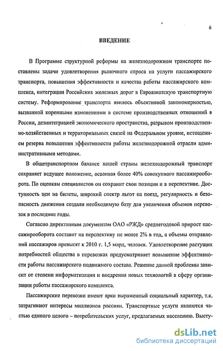 Согласно директивным документам ОАО «РЖД» среднегодовой прирост пас-сажирооборота составит на перспективу не менее 2% в год, а объемы отправлений пассажиров превысят к 2010 г. 1,5 млрд, человек. Удовлетворение растущих потребностей общества в перевозках предусматривает повышение эффективности работы пассажирского подвижного состава. Решение данной проблемы зависит от степени информатизации и внедрения новых технологий в сферу организации работы пассажирского комплекса.