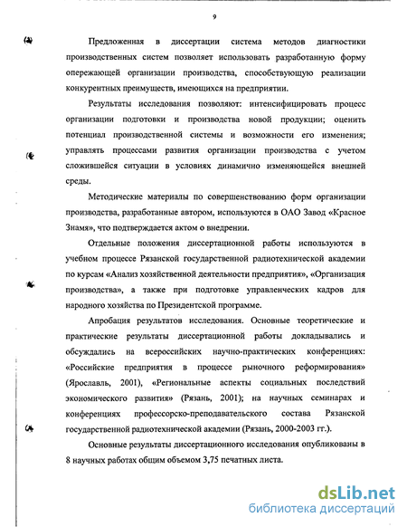 Результаты диссертационного исследования могут быть использованы руководителями и специалистами предприятий и их структурными подразделениями при определении необходимых условий для разработки и производства новой продукции, при управлении процессами организационного развития производственных систем, при разработке стратегии развития на основе опережающей организации производства (ф Предложенная в диссертации система методов диагностики производственных систем позволяет использовать разработанную форму опережающей организации производства, способствующую реализации конкурентных преимуществ, имеющихся на предприятии.