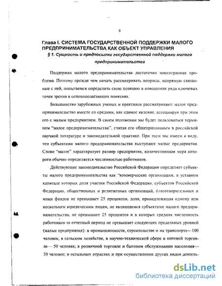 ГЛАВА I. Система государственной поддержки малого предпринимательства как объект управления 9
