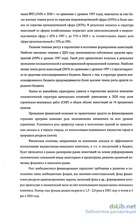Разными темпами растут в перспективе и источники формирования инвестиций. Наиболее высокими темпами к 2020 году увеличиваются собственные средства предприятий (459% к уровню 1997 года). Такой рост предполагает получить в результате проведения последовательной и целенаправленной промышленной политики. Наиболее низкие темпы роста инвестиций (201% по сравнению с уровнем 1997 г.) прогнозируются по средствам консолидированного бюджета. Вместе с тем, в структуре средств консолидированного бюджета предусматриваются более высокие темпы роста средств городского бюджета.