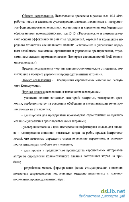 Предмет исследования - организационно-экономические отношения, возникающие в процессе управления производственными затратами.