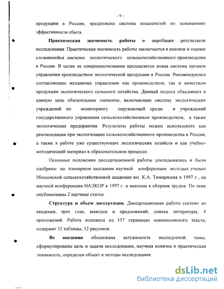 -6-окружающей среды, изучается проблема агроклиматического районирования сельскохозяйственного производства; АО "ЭкоНива" работает над созданием нормативной и законодательной базы, которая должна закрепить понятие "экологическая продукция", ею разработаны и приняты "Национальные Российские Стандарты экологического агропроизводства". Однако, ни одна экологическая или научная организация не проводила комплексный экономический анализ экологического сельского хозяйства в России, не был проведен и анализ развития производства и сбыта экологической продукции, анализ организационной структуры управления им и т.д. Вопросы организации управления экологическим сельским хозяйством недостаточно разработаны, как в Министерстве сельского хозяйства и продовольствия РФ, так и на региональном уровне.