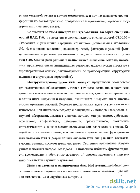 Соответствие темы диссертации требованиям паспорта специальностей ВАК. Работа выполнена в рамках паспорта специальностей 08.00.05 -Экономика и управление народным хозяйством (региональная экономика: 5.9. Исследование тенденций, закономерностей, факторов и условий функционирования и развития региональных социально-экономических,подсистем; 5.10. Оценка роли региона в национальной экономике, методы, показатели; производственная специализация регионов; экономическая структура в территориальном аспекте, закономерности ее трансформации; структурная политика и структурная перестройка).