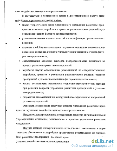 Научная новизна диссертационного исследования заключается в теоретическом обосновании и разработке практических рекомендаций по управлению развитием предприятий на основе принятия управленческих решений в Условиях воздействия факторов неопределенности.