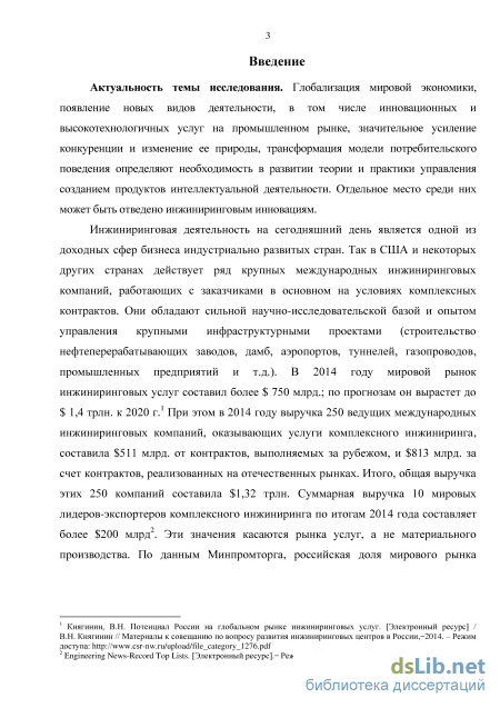 востребованного заказчиком инжинирингового продукта за счет внедрения инноваций. Все сказанное обуславливает актуальность темы диссертационной работы, которая может быть обоснована также принятием в нашей стране ряда нормативно-правовых актов, включая государственную программу «Развитие промышленности и повышение ее конкурентоспособности», а также «Концепцию мониторинга рынка инжиниринговых услуг», в реализации которых важную роль играет развитие инновационно ориентированного инжинирингового бизнеса. Важно подчеркнуть, что объектом изучения является один из видов деятельности четвертичного сектора экономики или экономики знаний, который, безусловно, предполагает инновационную составляющую.