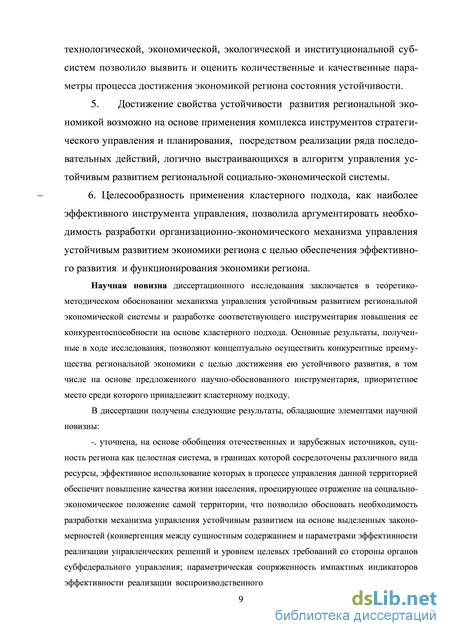 2. Опираясь на кластерный подход в процессе развития региональной экономики и достижения ею свойства устойчивости, в диссертации обоснована необходимость разработки механизма управления устойчивым развитием, что позволит усилить конкурентные преимущества региона и тем самым повысить его конкурентоспособность. При формировании механизма управления устойчивым развитием экономики региона на основе создания и функционирования кластеров необходимо учитывать интересы самих территорий, хозяйствующих субъектов данной территории, а также взаимоотношения между уровнями власти, бизнесом и обществом.