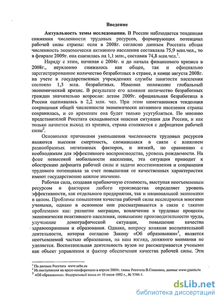 Рабочая сила, создавая прибавочную стоимость, выступая неотъемлемым ресурсом и фактором любого производства, определяет уровень эффективности, как отдельного предприятия, так и национальной экономики в целом. Вопросы повышения качества рабочей силы исследуются многими учеными, однако в основном они рассматриваются в связи с такими проблемами как: развитие миграции, вовлечение в трудовые процессы экономически неактивного населения, повышение производительности труда, улучшение демографической ситуации, повышение качества здравоохранения и образования. Однако вопросу влияния воспитательной деятельности, которая согласно Закону «Об образовании»3, является неотъемлемой частью образования, на наш взгляд, должного внимания не уделяется. Воспитательная деятельность вузов не рассматривается учеными как объект управления и фактор обеспечения качества рабочей силы. Эти обстоятельства и предопределили актуальность темы настоящего диссертационного исследования.
