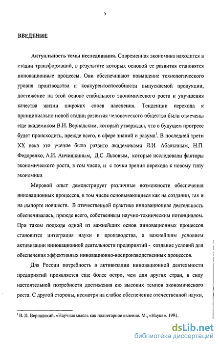 Актуальность темы исследования. Современная экономика находится в стадии трансформаций, в результате которых основой ее развития становятся инновационные процессы. Они обеспечивают повышение технологического уровня производства и конкурентоспособности выпускаемой продукции, достижение на этой основе стабильного экономического роста и улучшения качества жизни широких слоев населения. Тенденции перехода к принципиально новой стадии развития человеческого общества были отмечены еще академиком В.И. Вернадским, который утверждал, что в будущем прогресс будет происходить, прежде всего, в сфере знаний и разума1. В последней трети XX века это учение было развито академиками Л.И. Абалкиным, Н.П. Федоренко, А.И. Анчишкиным, Д.С. Львовым, которые исследовали факторы экономического роста, в том числе, и с точки зрения перехода к новому типу экономики.