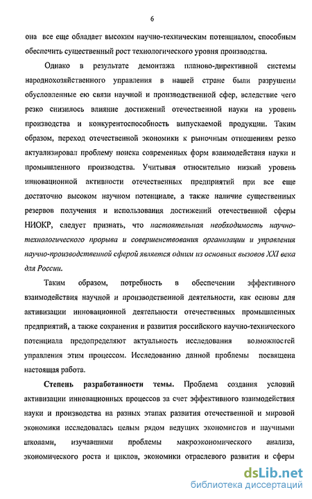 Степень разработанности темы. Проблема создания условий активизации инновационных процессов за счет эффективного взаимодействия науки и производства на разных этапах развития отечественной и мировой экономики исследовалась целым рядом ведущих экономистов и научными школами, изучавшими проблемы макроэкономического анализа, экономического роста и циклов, экономики отраслевого развития и сферы
