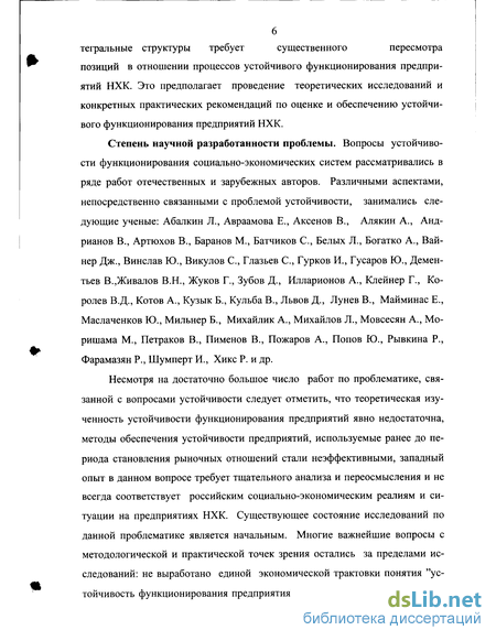 Несмотря на достаточно большое число работ по проблематике, связанной с вопросами устойчивости следует отметить, что теоретическая изученность устойчивости функционирования предприятий явно недостаточна, методы обеспечения устойчивости предприятий, используемые ранее до периода становления рыночных отношений стали неэффективными, западный опыт в данном вопросе требует тщательного анализа и переосмысления и не всегда соответствует российским социально-экономическим реалиям и ситуации на предприятиях НХК. Существующее состояние исследований по данной проблематике является начальным. Многие важнейшие вопросы с методологической и практической точек зрения остались за пределами исследований: не выработано единой экономической трактовки понятия "устойчивость функционирования предприятия" , не раскрыта сущность и эко номическое содержание устойчивости, не рассмотрены