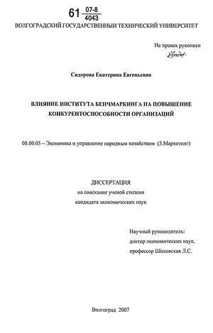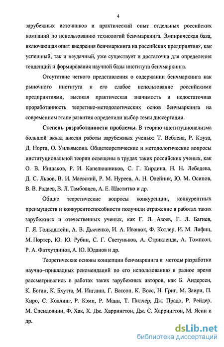 Отсутствие четкого представления о содержании бенчмаркинга как рыночного института и его слабое использование российскими предприятиями, высокая практическая значимость и недостаточная проработанность теоретико-методологических основ бенчмаркинга на современном этапе развития определили выбор темы диссертации.