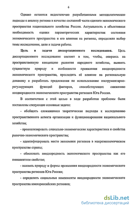 Цель и задачи диссертационного исследования. Цель диссертационного исследования состоит в том, чтобы, опираясь на пространственную концепцию развития народного хозяйства, выявить сущностную природу и особенности проявления неоднородности экономического пространства, проследить её влияние на региональную динамику и разработать предложения по использованию инструментарно-регулирующих функций факторов, способствующих снижению неоднородности экономического пространства регионов Юга России.