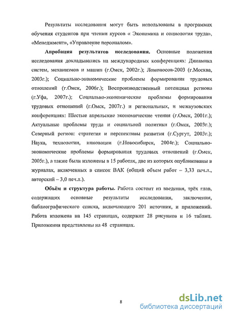 Апробация результатов исследования. Основные положения исследования докладывались на международных конференциях: Динамика систем, механизмов и машин (г.Омск, 2002г.); Ломоносов-2003 (г.Москва, 2003г.); Социально-экономические проблемы формирования трудовых отношений (г.Омск, 2006г.); Воспроизводственный потенциал региона (г.Уфа, 2007г.); Социально-экономические проблемы формирования трудовых отношений (г.Омск, 2007г.) и региональных, и межвузовских конференциях: Шестые апрельские экономические чтения (г.Омск, 2001г.); Актуальные проблемы труда и социальной политики (г.Омск, 2003г.); Северный регион: стратегия и перспективы развития (г.Сургут, 2003г.); Наука, технологии, инновации (г.Новосибирск, 2004г.); Социально-экономические проблемы формирования трудовых отношений (г.Омск, 2005г.), а также были изложены в 15 работах, две из которых опубликованы в журналах, включенных в список ВАК (общий объем работ - 3,33 печ.л., авторский - 3,0 печ.л.).