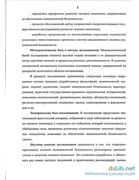 Эмпирическая база исследования. В исследовании представлен значительный фактический материал, собранный в ходе наблюдения за развитием газового комплекса и отдельных его субъектов, который использовался в обобщенном виде, приведены различные количественные значения отраслевых показателей, влияющих на обеспечение экономической безопасности страны.