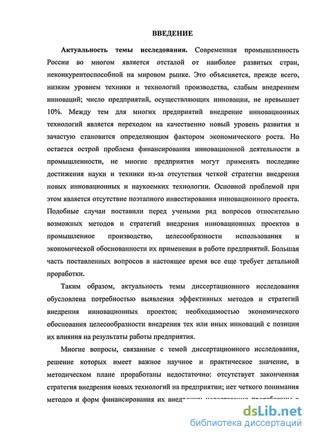 Таким образом, актуальность темы диссертационного исследования обусловлена потребностью выявления эффективных методов и стратегий внедрения инновационных проектов; необходимостью экономического обоснования целесообразности внедрения тех или иных инноваций с позиции их влияния на результаты работы предприятия.