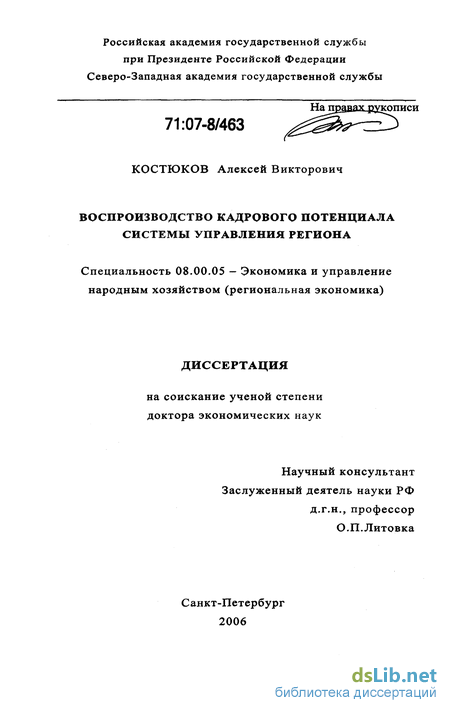 Предметом исследования является процесс воспроизводства кадрового потенциала системы управления социально-экономическим развитием субъекта Российской Федерации.