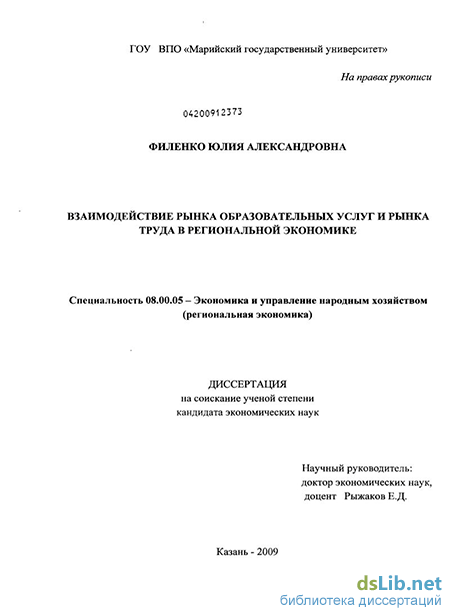 Объектом исследования являются региональные рынки образовательных услуг и труда в их взаимодействии в современной российской экономике.