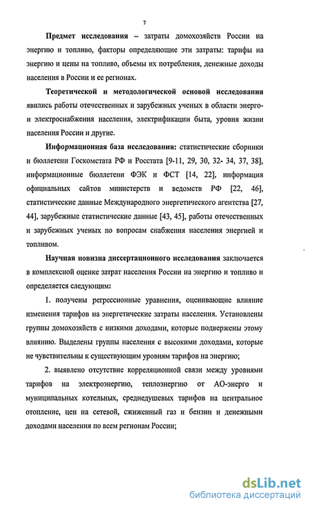 Предмет исследования - затраты домохозяйств России на энергию и топливо, факторы определяющие эти затраты: тарифы на энергию и цены на топливо, объемы их потребления, денежные доходы населения в России и ее регионах.