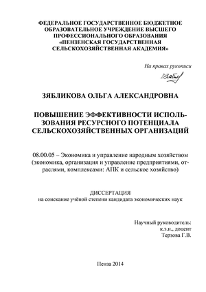 Целью диссертационного исследования являются развитие теоретических положений, разработка методических и практических рекомендаций по повышению эффективности использования ресурсного потенциала сельскохозяйственных организаций.