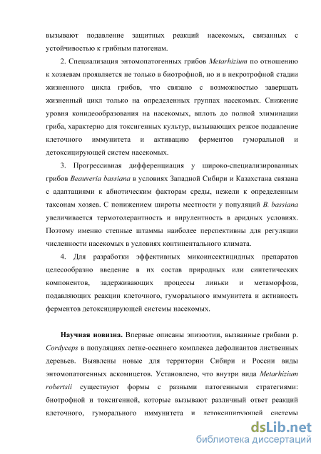 Широко-специализированные анаморфные грибы в аутэкологических экспериментах не демонстрируют специализации по отношению к хозяевам определенных таксонов. В тоже время их специализация может быть связана с некротрофной стадией развития, когда дочернее спороношение может развиваться лишь на определенных таксонах хозяев. Соответственно, уровень вирулентности не всегда может являться критерием приспособленности популяции гриба к определенному виду хозяина. Высокая вирулентность может быть связана с токсигенной стратегией, которая свидетельствует о несбалансированных паразито-хозяинных отношениях и может быть связана с адаптациями гриба к сапротрофому развитию. Сходные тенденции были выявлены для энтомофторовых грибов (Воронина и др., 1997). При патогенезах, проходящих по токсигенному типу происходит более быстрое подавление клеточного иммунитета, активация детоксицирующих ферментов и «острое» развитие заболевания. При этом раннее истощение и быстрая гибель хозяина может приводить к значительному снижению уровня дочерней инфекции патогена. Однако, отметим, что это касается прежде всего гибели хозяев и грибов на стадии колонизации ими кутикулы и гемолимфы. Причины гибели патогена после формирования склероциев остаются не раскрытыми.