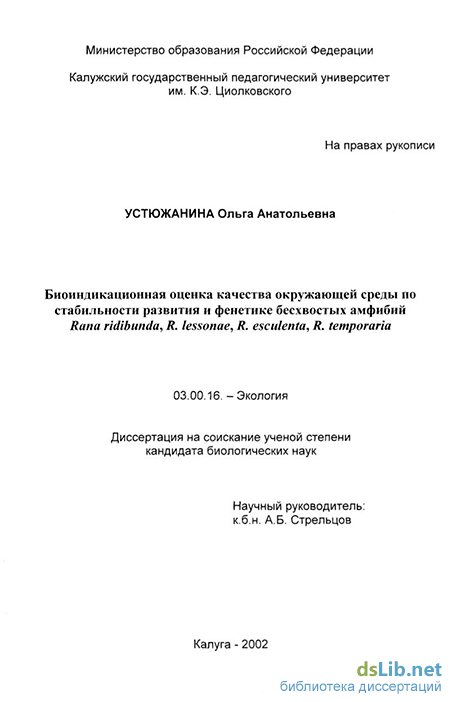 Устюжанина Ольга Анатольевна. Биоиндикационная оценка качества окружающей среды по стабильности развития и фенетике бесхвостых амфибий Rana ridibunda, R. lessonae, R. esculenta, R. temporaria : диссертация ... кандидата биологических наук : 03.00.16.- Калуга, 2002.- 168 с.: ил. РГБ ОД, 61 03-3/563-8