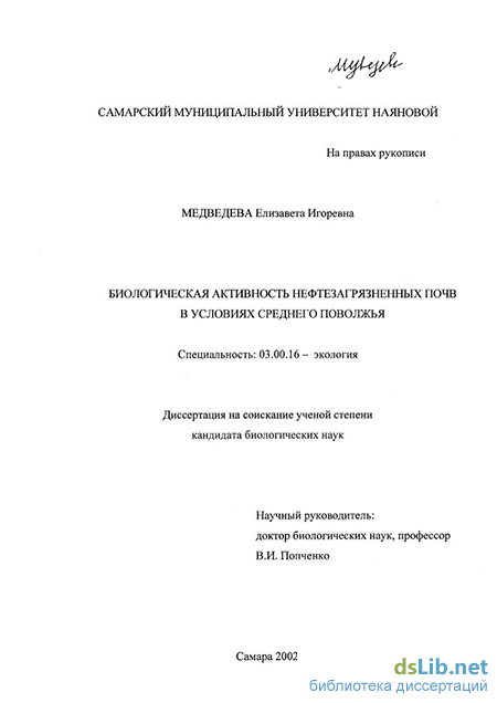 Медведева Елизавета Игоревна. Биологическая активность нефтезагрязненных почв в условиях Среднего Поволжья : диссертация ... кандидата биологических наук : 03.00.16.- Самара, 2002.- 211 с.: ил. РГБ ОД, 61 03-3/495-X