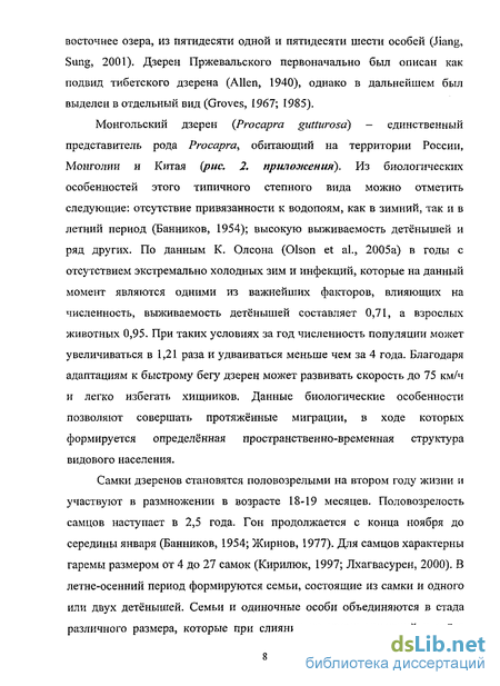 Монгольский дзерен (Procapra gutturosa) - единственный представитель рода Procapra обитающий на территории России, Монголии и Китая (рис. 2. приложения). Из биологических особенностей этого типичного степного вида можно отметить следующие: отсутствие привязанности к водопоям, как в зимний, так и в летний период (Банников, 1954); высокую выживаемость детёнышей и ряд других. По данным К. Олсона (Olson et al., 2005а) в годы с отсутствием экстремально холодных зим и инфекций, которые на данный момент являются одними из важнейших факторов, влияющих на численность, выживаемость детёнышей составляет 0,71, а взрослых животных 0,95. При таких условиях за год численность популяции может увеличиваться в 1,21 раза и удваиваться меньше чем за 4 года. Благодаря адаптациям к быстрому бегу дзерен может развивать скорость до 75 км/ч и легко избегать хищников. Данные биологические особенности позволяют совершать протяжённые миграции, в ходе которых формируется определённая пространственно-временная структура видового населения.